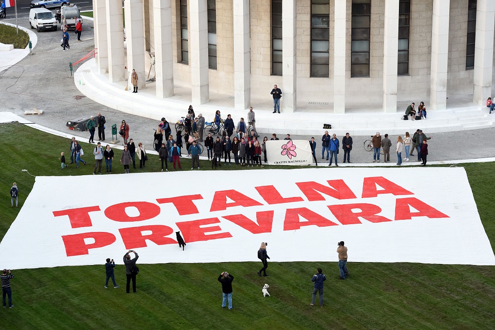 Inicijativa „Vratite magnoliju“ u srijedu je postavljanjem transparenata „Totalna prevara“ na Trgu žrtava fašizma u Zagrebu iznova upozorila na, kako navode, neprihvatljivu devastaciju tog trga te nepoštivanje zakona i procedure pri uređivanju zaštićenih kulturnih dobara u Zagrebu.