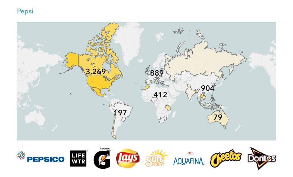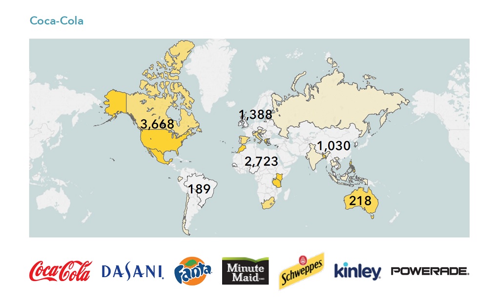 Među navedenim korporacijama, samo su prve tri - Coca-Cola, PepsiCo i Nestlé, činile čak 14 posto brendiranog plastičnog otpada. Među top tri najveća onečišćivača, Coca-Cola prednjači sa svojim plastičnim otpadom koji je pronađen duž obala, u parkovima i na ulicama u čak 40 od 42 zemlje. Specifično u SAD-u, temeljem ukupno 70 provedenih akcija čišćenja utvrđeno je da su Nestlé, PepsiCo i Coca-Cola najgori korporacijski plastični onečišćivači, upravo tim redoslijedom.