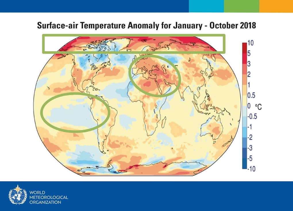 Prijevremena izjava o stanju globalne klime za 2018. pokazuje da su se temperature tijekom prvih deset mjeseci 2018. godine bile gotovo 1 °C iznad predindustrijske razine. IPCC-ovo izvješće, objavljeno u listopadu ove godine, pokazalo je da su prosječna globalne temperature između 2006. i 2015. bile 0,86 °C iznad predindustrijske razine, a u posljednjih pet godina, između 2004. i 2018., 1,04 °C iznad predindustrijske razine.