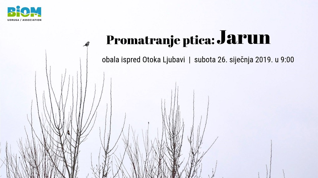 Udruga Biom u subotu, 26. siječnja 2019. u 9:00 sati organizira promatranje ptica na Jarunu. Sada je pravi trenutak da se ptice pjevice lakše opaze dok su stabla u potpunosti bez lišća. Okupljanje je na obali jezera ispred otoka Ljubavi na adresi Aleja Mateja Ljubeka 23. Jarun je atraktivno mjesto za rekreaciju i odmor brojnih građana. Zbog svoje velike vodene površine i brojnih šumaraka lokacija je privlačna mnogim vrstama ptica, posebice tijekom zime. Očekivane vrste su liska, divlja patka, labud, zelendur, zeba, brgljez, crvendać, velika sjenica, plavetna sjenica, gugutka…