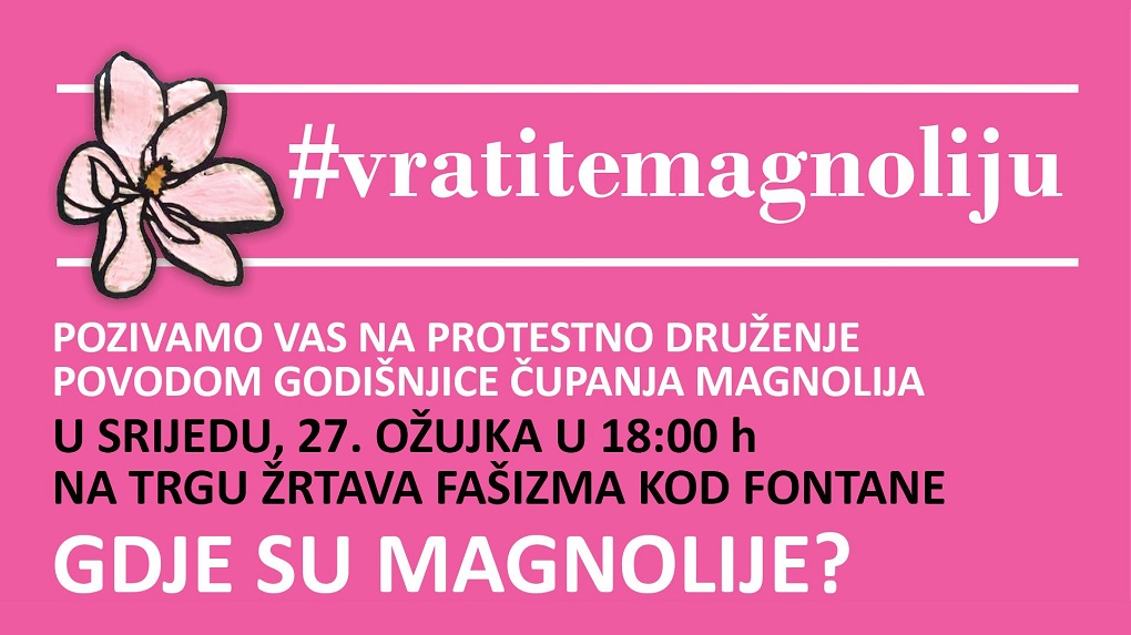 U subotu 23. ožujka 2019. navršilo se točno godinu otkako su iščupane magnolije s Trga žrtava fašizma. Bio je to čin koji su brojne građanke i građani, udruge, inicijative, ali i strukovna udruženja prepoznale kao nasilje nad javnim prostorom i kao ogledni primjer načina na koji strukture vlasti u gradu Zagrebu na čelu s Milanom Bandićem vode ovaj grad, poručuju iz Inicijative „Vratite magnoliju“.