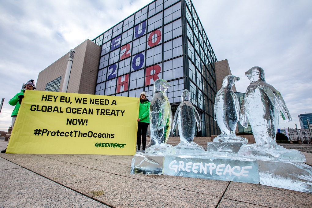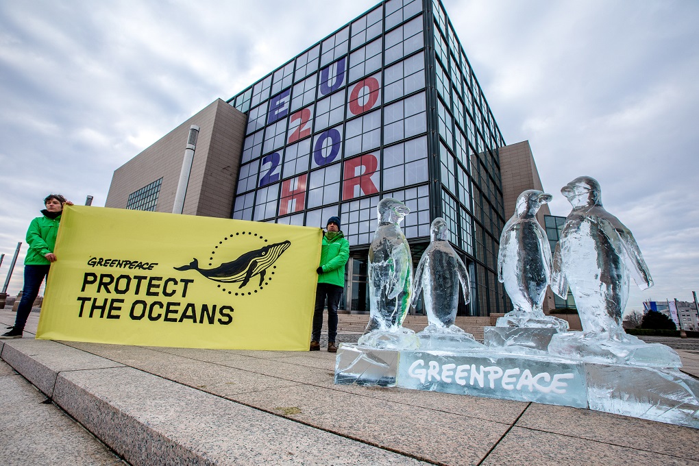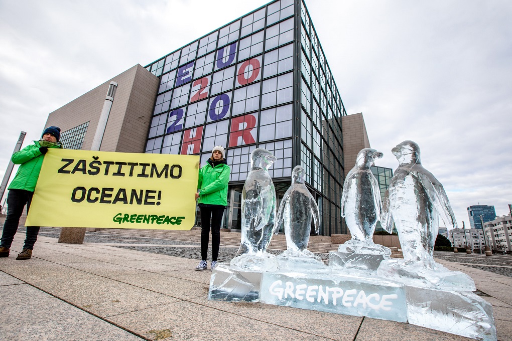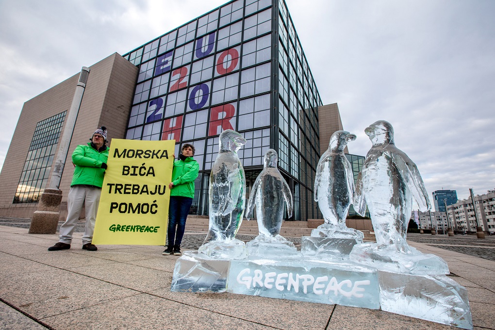U sklopu međunarodne kampanje za zaštitu oceana, aktivisti Greenpeacea su ispred zgrade Nacionalne i sveučilišne knjižnice, središnjeg mjesta hrvatskog predsjedanja Vijećem EU, izložili ledenu skulpturu pingvina. Zagreb se tako pridružio globalnoj akciji koja se idućih dana održava u dvadesetak zemalja svijeta, a kojom se traži snažan globalni Sporazum o svjetskim morima.