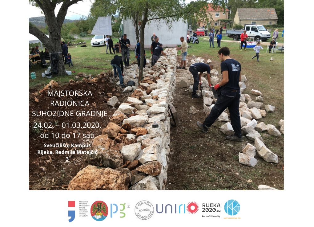 Susjedstvo Kampus, jedno od 27 susjedstava Europske prijestolnice kulture, poziva sve zainteresirane građane na besplatnu majstorsku radionicu izrade suhozida, namijenjenu svim uzrastima (od djece do umirovljenika), koja će se održavati od 24. veljače do 1. ožujka 2020. godine, svakodnevno od 10 do 17 sati na Sveučilišnom Kampusu Rijeka (Radmile Matejčić 3, teren pored Građevinskog fakulteta).