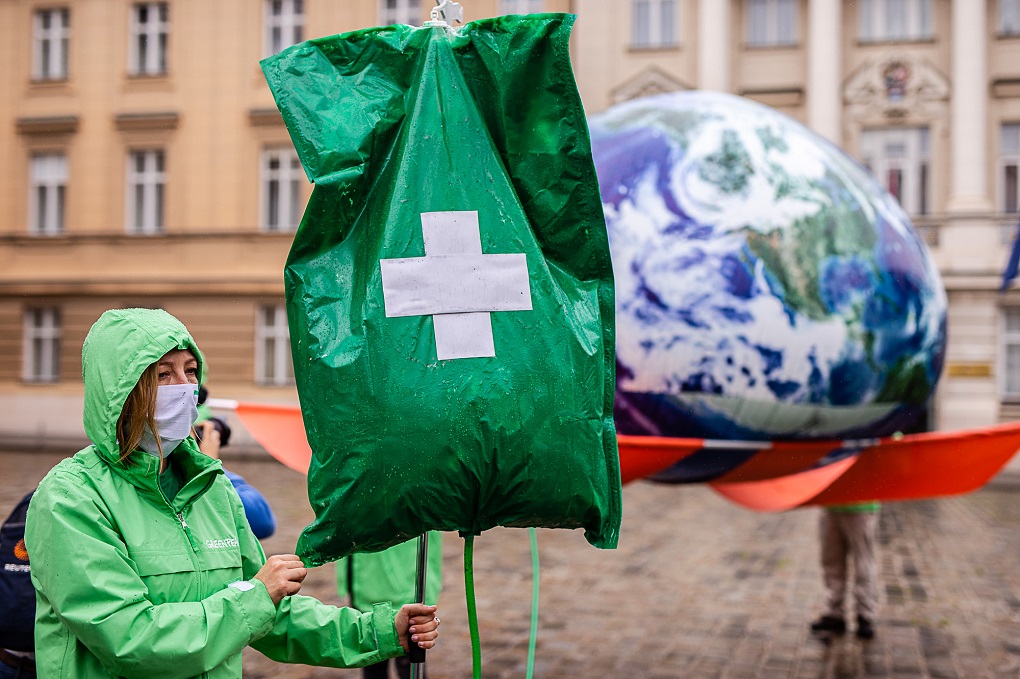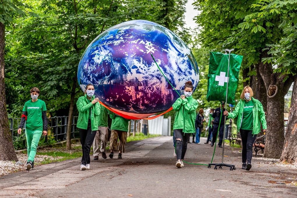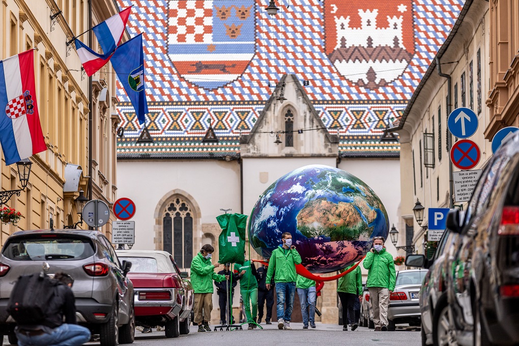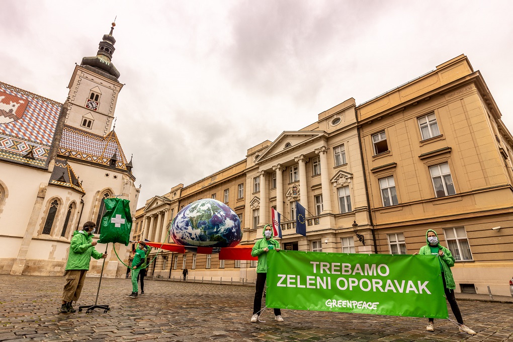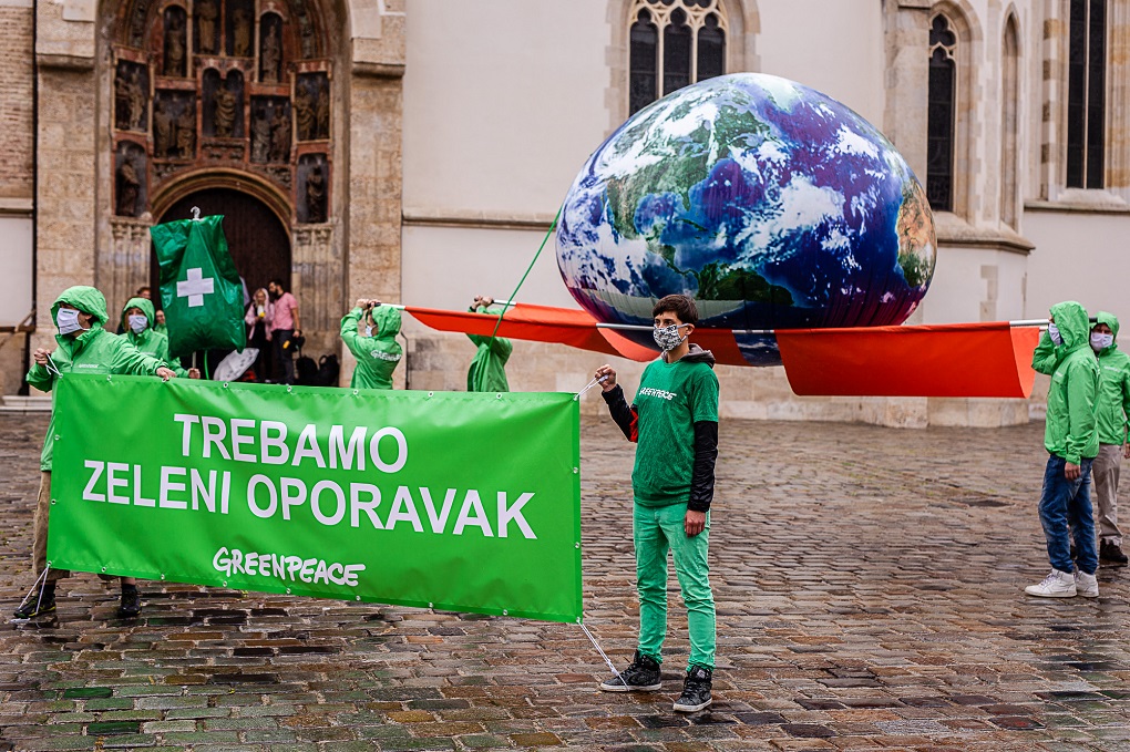 Aktivisti Greenpeacea u utorak su ispred zgrade Hrvatskog sabora na Trgu sv. Marka, na četverometarskim nosilima donijeli rekvizit planeta Zemlje spojen na infuziju. Ovim performansom ukazali su na alarmantno stanje našeg planeta te naglasili potrebu za „zelenim oporavkom“, odnosno stavljanjem zaštite okoliša i klime u središte planiranja oporavka od pandemije koronavirusa.