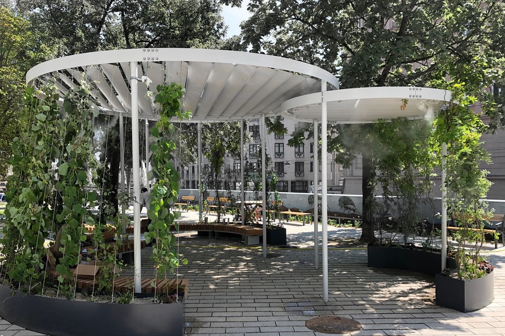 - Središte parka predstavlja gotovo četiri metra visoka konstrukcija prekrivena zelenilom i opremljena s tri prstena mlaznica iz kojih se raspršuje vodena maglica koja isparava i upija toplinu iz okoliša / © PID - Christian Fürthner