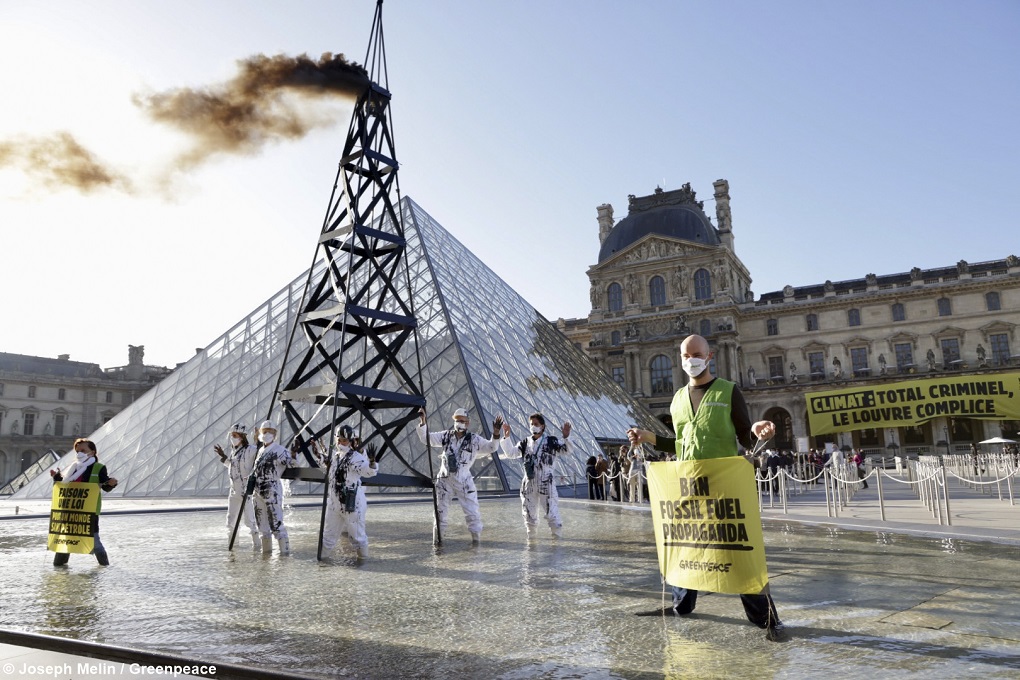 - Francuski aktivisti i aktivistkinje Greenpeacea su 6. listopada 2021. osudili partnerstvo Louvrea i multinacionalne kompanije TotalEnergies. © Joseph Melin / Greenpeace France