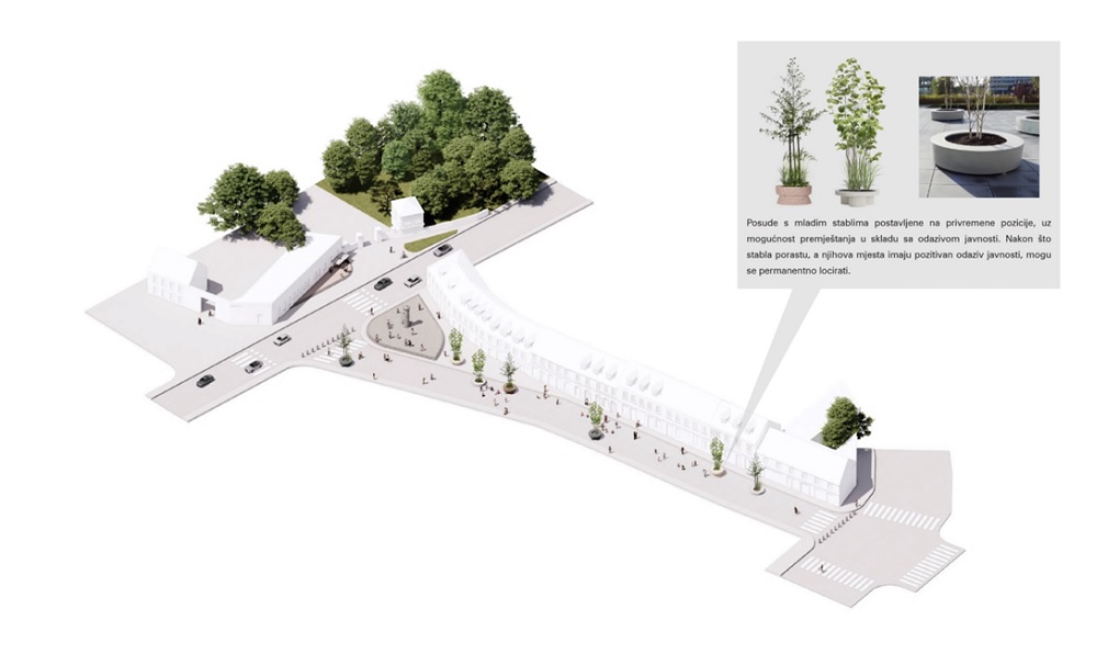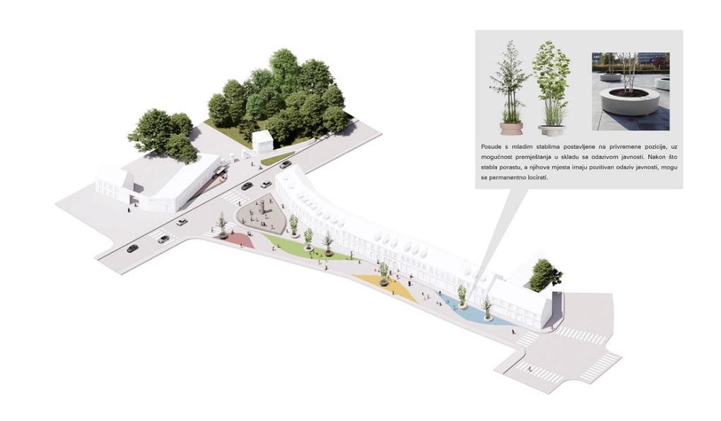 Podna ploha će se preobraziti polutrajnim oslikavanjem oko žardinjera kako bi se tako označila mirnija zona zadržavanja, a između oslikanih otoka sugerirat će se šetnica i kretanje kroz prostor nove pješačke zone.