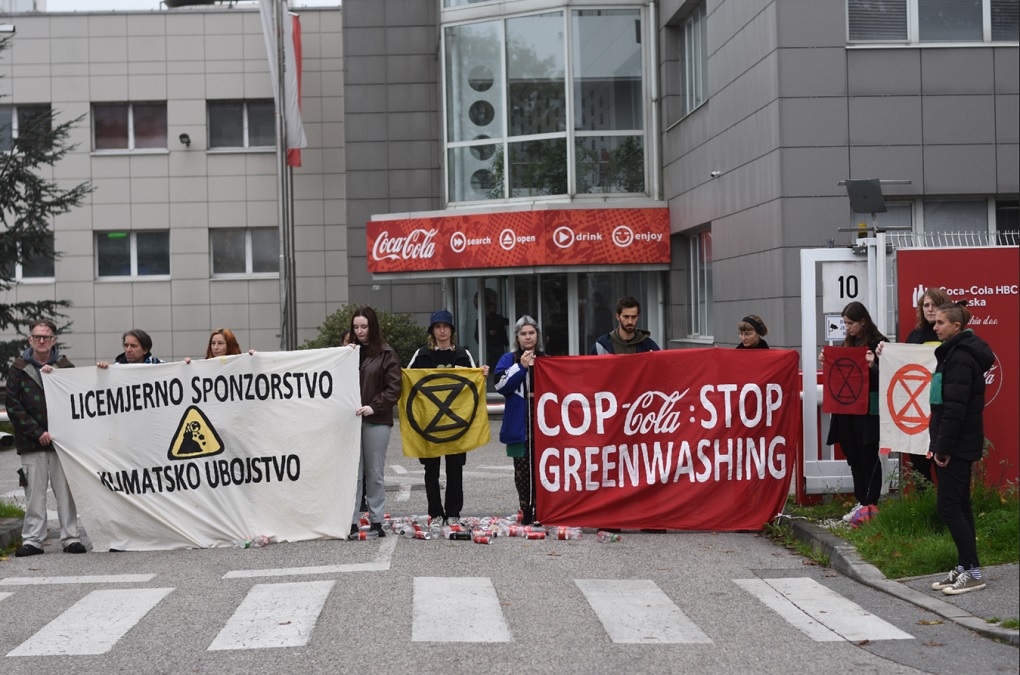 Aktivistkinje i aktivisti blokirali su ulaz u zagrebačko sjedište Coca-Cole, prosuli prazne boce i limenke Coca-Colinih proizvoda ispred ulaza i rastegnuli transparente na kojima je pisalo „Licemjerno sponzorstvo - klimatsko ubojstvo“ te „COP-Cola STOP GREENWASHING“.