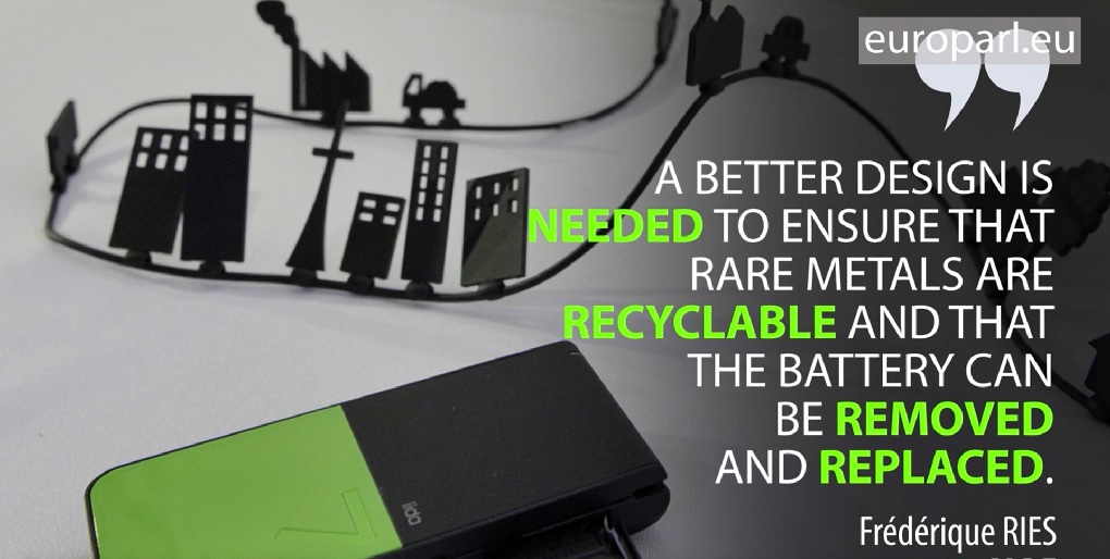 „Trebamo pronaći rješenje koje će unaprijediti „ekološku ravnotežu“ mobilnih telefona od kojih se samo 5 % može reciklirati. Potreban je bolji dizajn koji će omogućiti recikliranje rijetkih metala i uklanjanje ili zamjenu baterije“, tvrdi belgijska zastupnica Frédérique Ries iz Kluba zastupnika Saveza liberala i demokrata za Europu (ALDE).