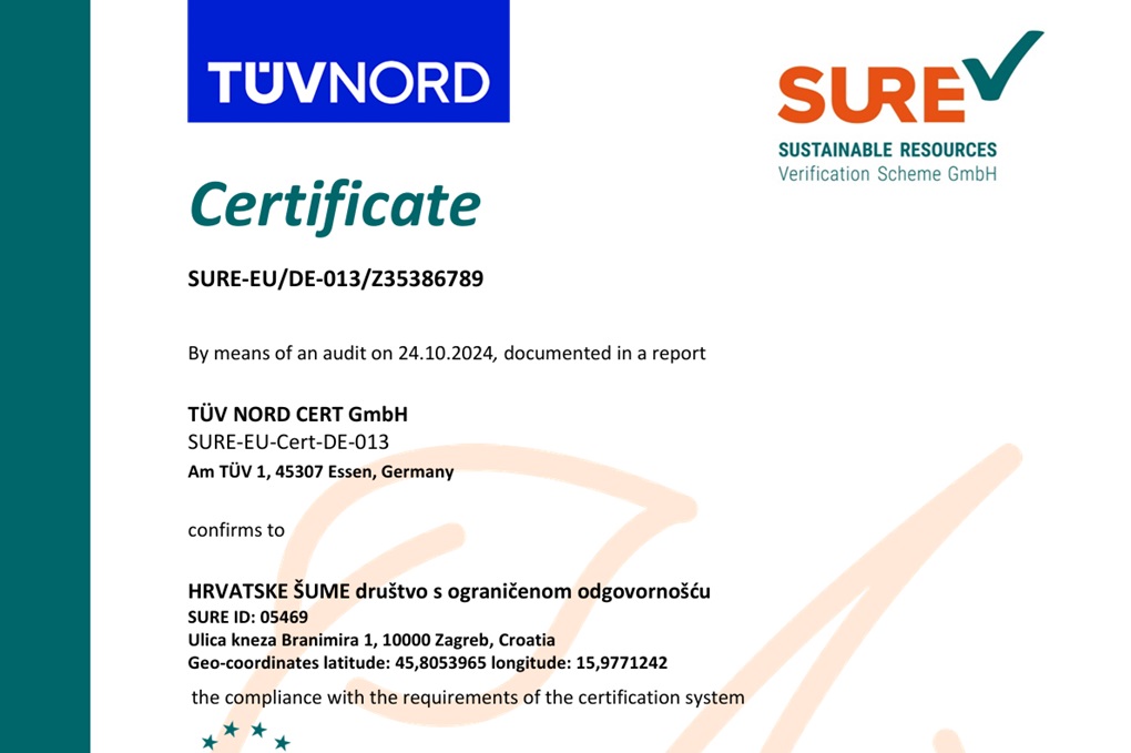 Početkom godine Hrvatskim šumama d.o.o. prvi je put dodijeljen SURE certifikat kojim se potvrđuje da šumsku biomasu proizvode u skladu s kriterijima održivosti. Obnova certifikata potvrda je uspješnog poslovanja i dokaz da šumska biomasa koju proizvode Hrvatske šume d.o.o. zadovoljava sve kriterije održivosti utvrđene Direktivom (EU) 2018/2001 Europskog parlamenta i Vijeća od 11. prosinca 2018. o promicanju uporabe energije iz obnovljivih izvora, izvijestili su iz Hrvatskih šuma.