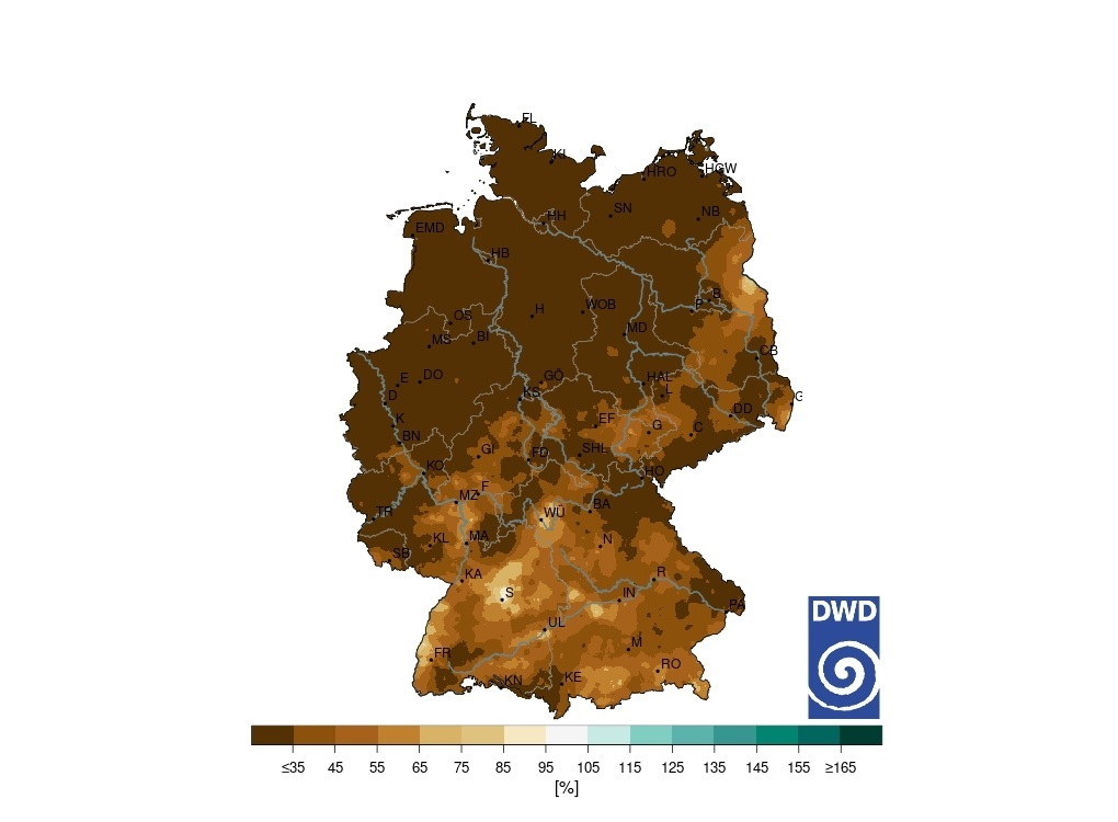Između 1. veljače i 13. travnja 2025. Njemačka meteorološka služba (Deutscher Wetterdienst - DWD) diljem Njemačke izmjerila je samo oko 40 litara kiše po četvornom metru. Riječ je o značajnom smanjenju od oko 88 litara ili 68 posto u odnosu na referentno razdoblje 1991.-2020.