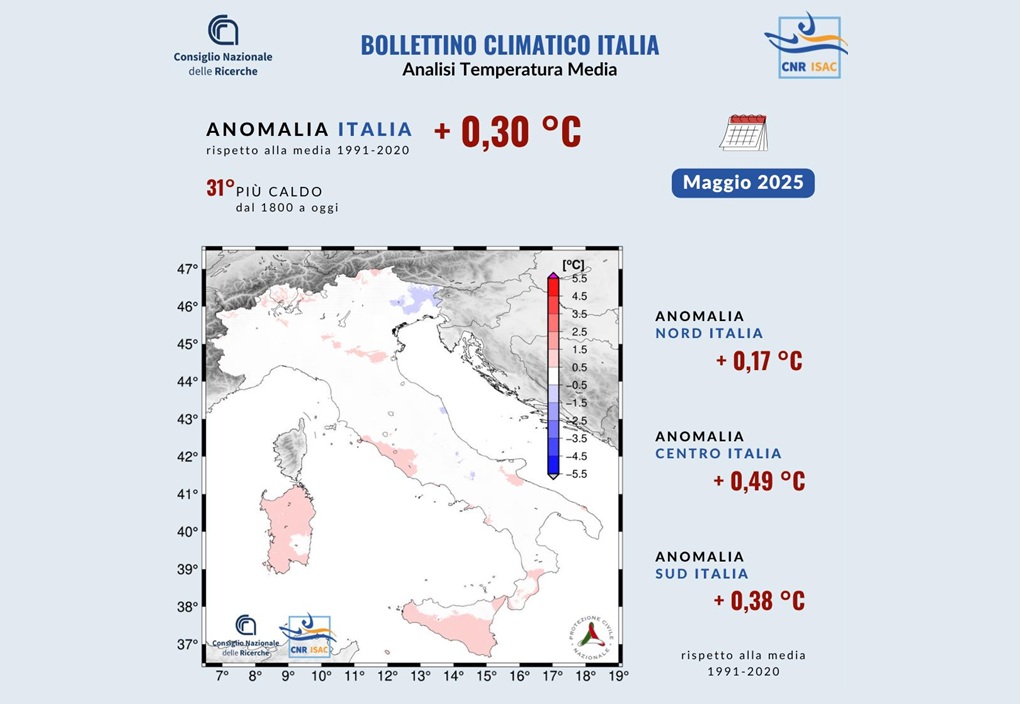 Prema podacima talijanskog Instituta za atmosferske znanosti i klimu (Istituto di Scienze dell'Atmosfera e del Clima | CNR-ISAC), svibanj 2025. bio je +0,30 °C topliji u odnosu na prosjek razdoblja 1991.-2020. Prošli mjesec bio je tako najtopliji svibanj od početka mjerenja u 19. stoljeću.