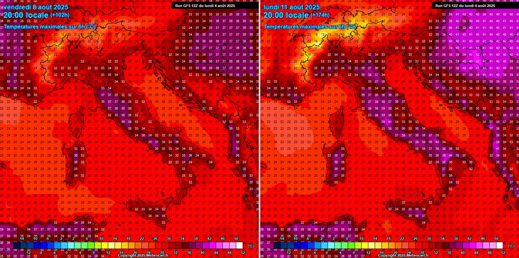 - Italija i središnji Mediteran – petak 8. i ponedjeljak 11. kolovoza 2025. - Italija ponovno pod naletom ekstremnih temperatura, osobito u Padskoj nizini. © Meteociel.fr