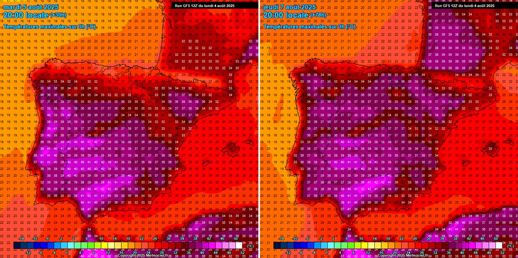 - Pirenejski poluotok – utorak 5. i četvrtak 7. kolovoza 2025. - Vrhunac toplinskog vala na jugozapadu Europe © Meteociel.fr