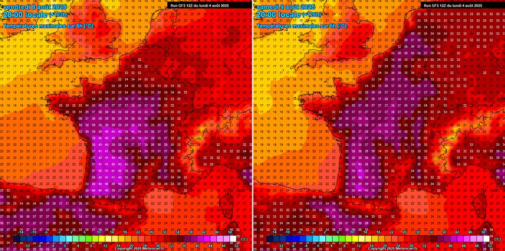 - Francuska – petak 8. i subota 9. kolovoza 2025. - Toplinski val u punom zamahu: jugzapad Francuske i dolina Rhône u ljubičastom – temperature i do 42 °C. © Meteociel.fr