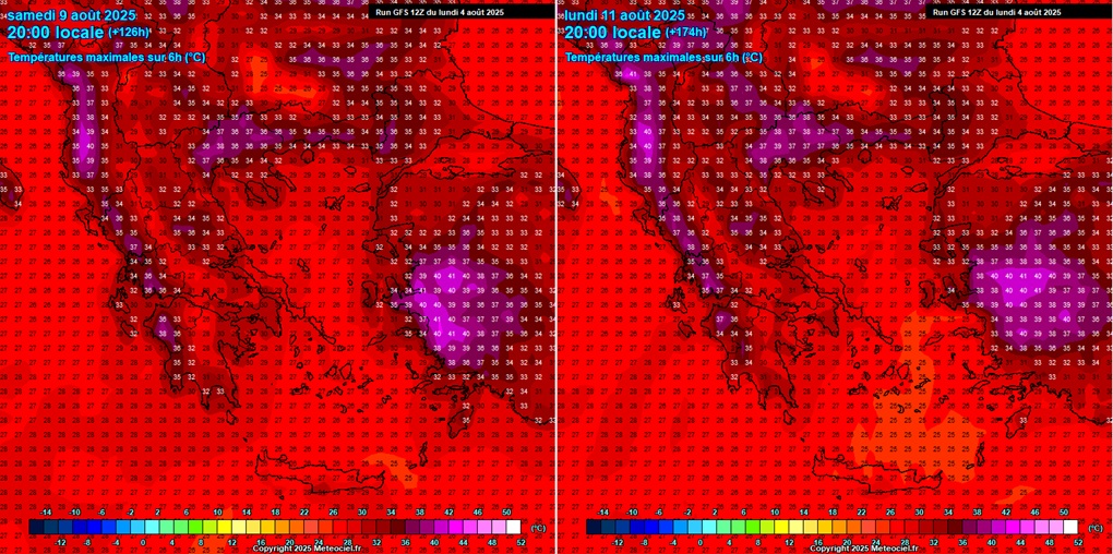 - Grčka i Balkan – subota 9. i ponedjeljak 11. kolovoza 2025. - Maksimalne dnevne temperature: Ekstremne vrućine šire se preko jugoistočne Europe s vrhuncima do 44 °C. © Meteociel.fr