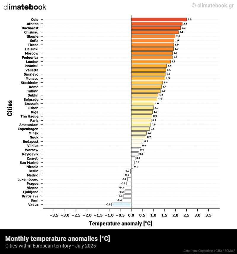 - Odstupanja prosječne temperature u europskim gradovima u srpnju 2025. u odnosu na prosjek za razdoblje 1991.–2020. © Copernicus EU | Climatebook