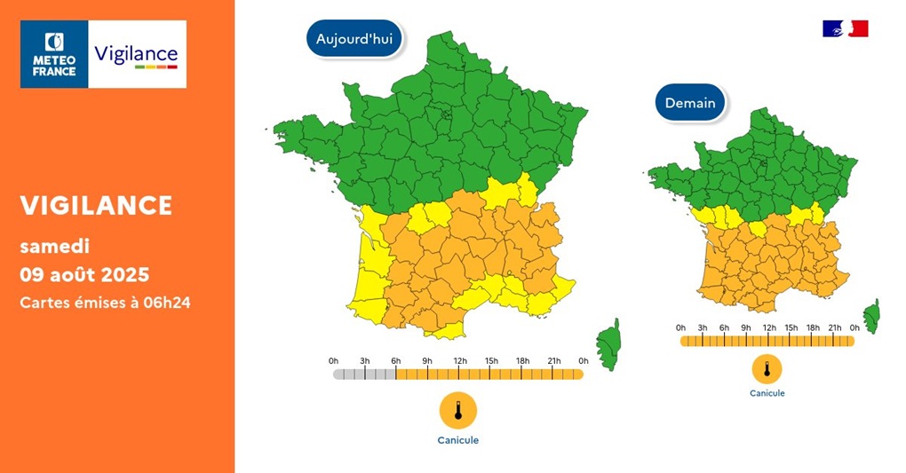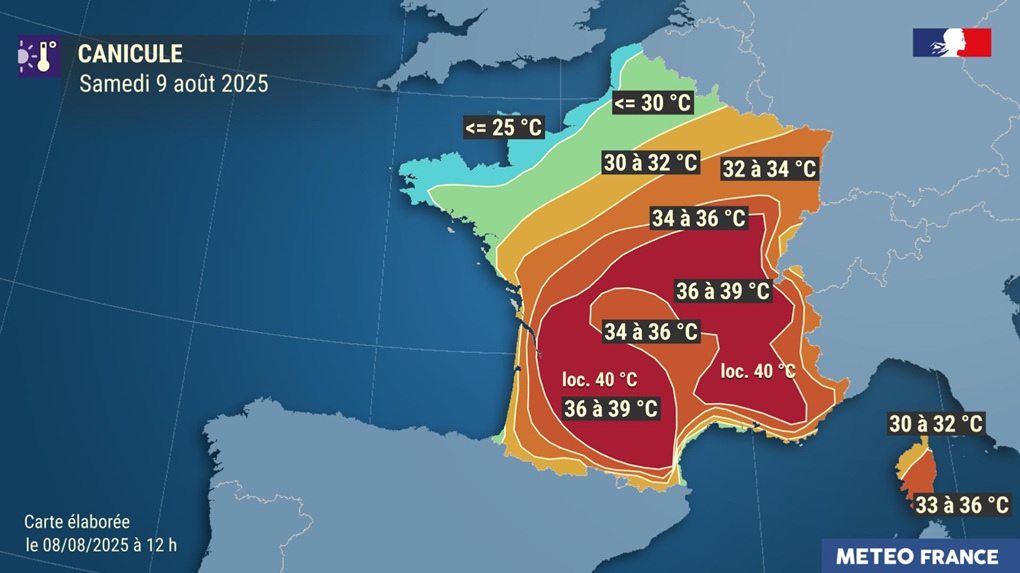 Na atlantskoj obali temperature se u subotu malo mijenjaju, ali u ostatku zemlje rastu – često između 36 i 39 °C, od istoka Nove Akvitanije do Rhône-Alpa, preko Okcitanije, unutrašnjosti Provanse, doline Auvergnea pa sve do zapada Burgundije i juga središnjeg dijela zemlje. Lokalno se očekuje do 40 °C.