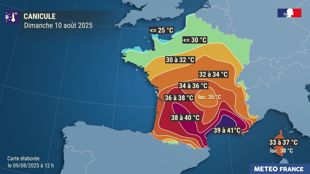 U nedjelju, 10. kolovoza, nastavlja se porast vrućine i to s najvišim vrijednostima u zaleđu Mediterana, gdje se očekuje 39 – 41 °C, osobito od podnožja Cévennesa do donje doline Rhône. Na jugozapadu zemlje, od Lota do Toulousea i Carcassonnea, očekuju se česte vrijednosti od 38 – 40 °C.