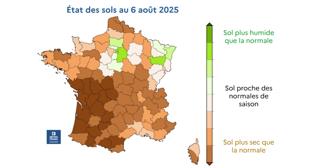 - Suhoća tla izraženija je na jugozapadu Francuske - podaci za 6. kolovoza 2025. © Météo-France