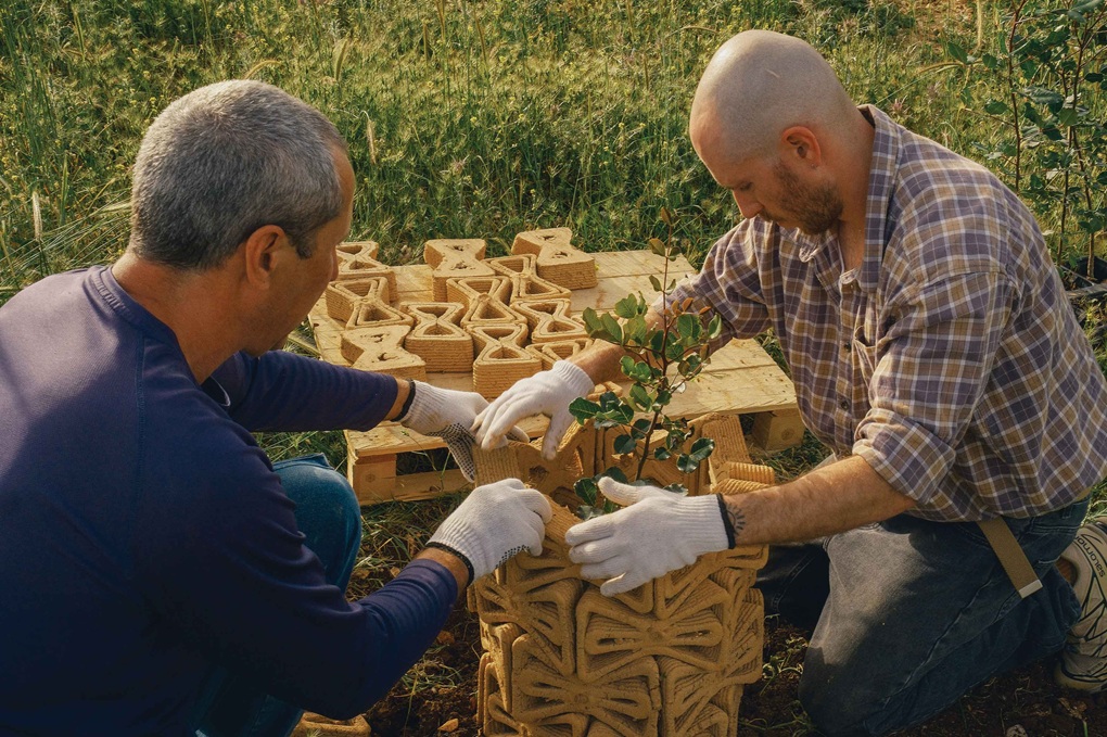 - Doktorand Ofer Asaf i inženjer Pavel Larianovsky sastavljaju TreeSoil strukturu oko sadnice rogača. Modularna struktura stvara mikroklimu koja štiti mlada stabla dok se ukorjenjuju u ekstremnim okolišnim uvjetima. © Technion Israel Institute Of Technology