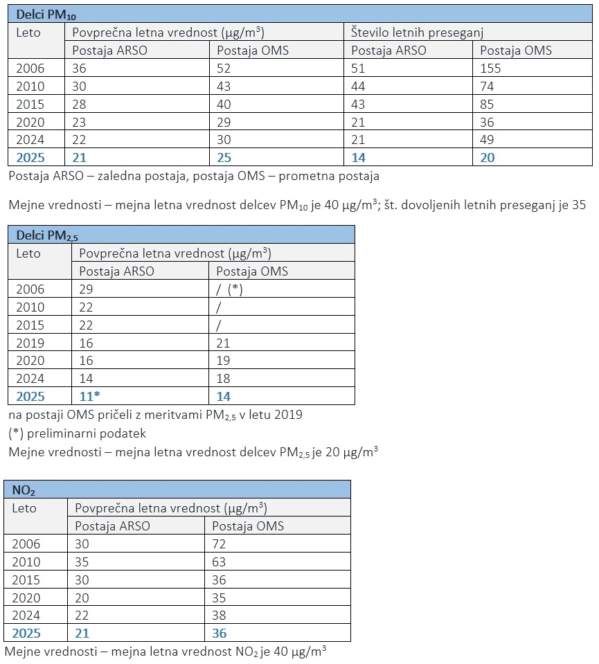 - Podaci u tablicama pokazuju kako se kvaliteta zraka u Ljubljani poboljšavala od 2006. godine © Mestna občina Ljubljana