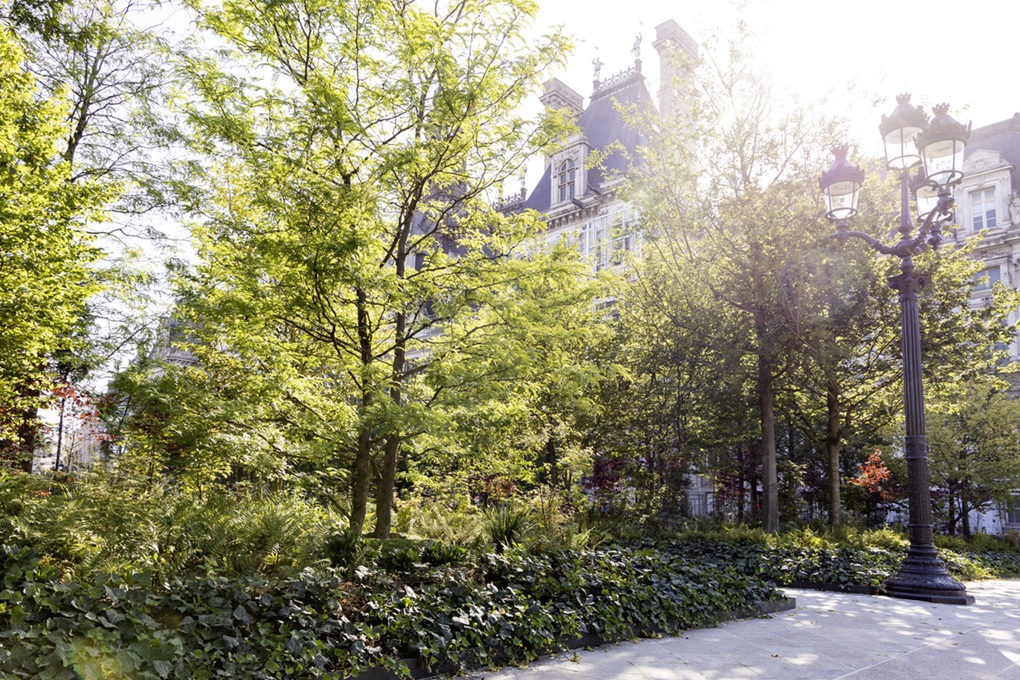 - Pogled iz urbane šume ispred pariške Gradske vijećnice (Hôtel de Ville) prema pariškoj katedrali Notre-Dame © Guillaume Bontemps | Ville de Paris