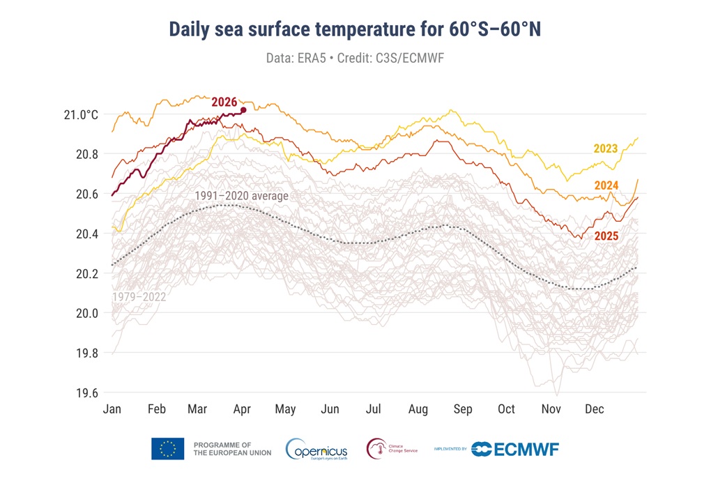 Prosječna temperatura površine mora (SST) u ožujku za izvan polarna područja oceana – između 60° južne i 60° sjeverne geografske širine – iznosila je 20,97 °C, što je druga najviša vrijednost nakon ožujka 2024., koji se približio kraju snažnog El Niño događaja. Značajno je da je dnevna temperatura površine mora postupno rasla tijekom cijelog ožujka. U skladu s tim, brojni klimatski centri, uključujući Europski centar za srednjoročne vremenske prognoze (ECMWF), prognoziraju prijelaz iz neutralnih uvjeta u El Niño u drugoj polovici 2026.